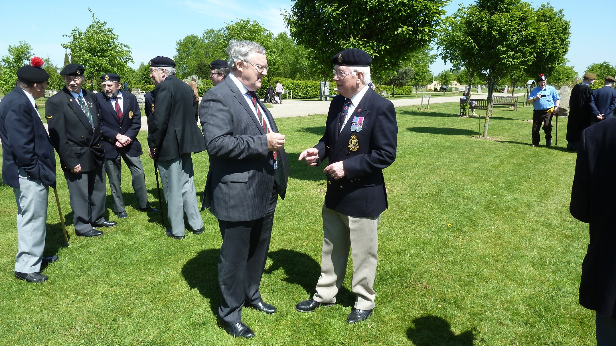 Brian Clarke of Lincolnshire (with Standard) chats to Vic Beresford and (hidden) David Harris, both of Leicester, They all served in the same HSF Company, E Coy 7 R Anglian (V)